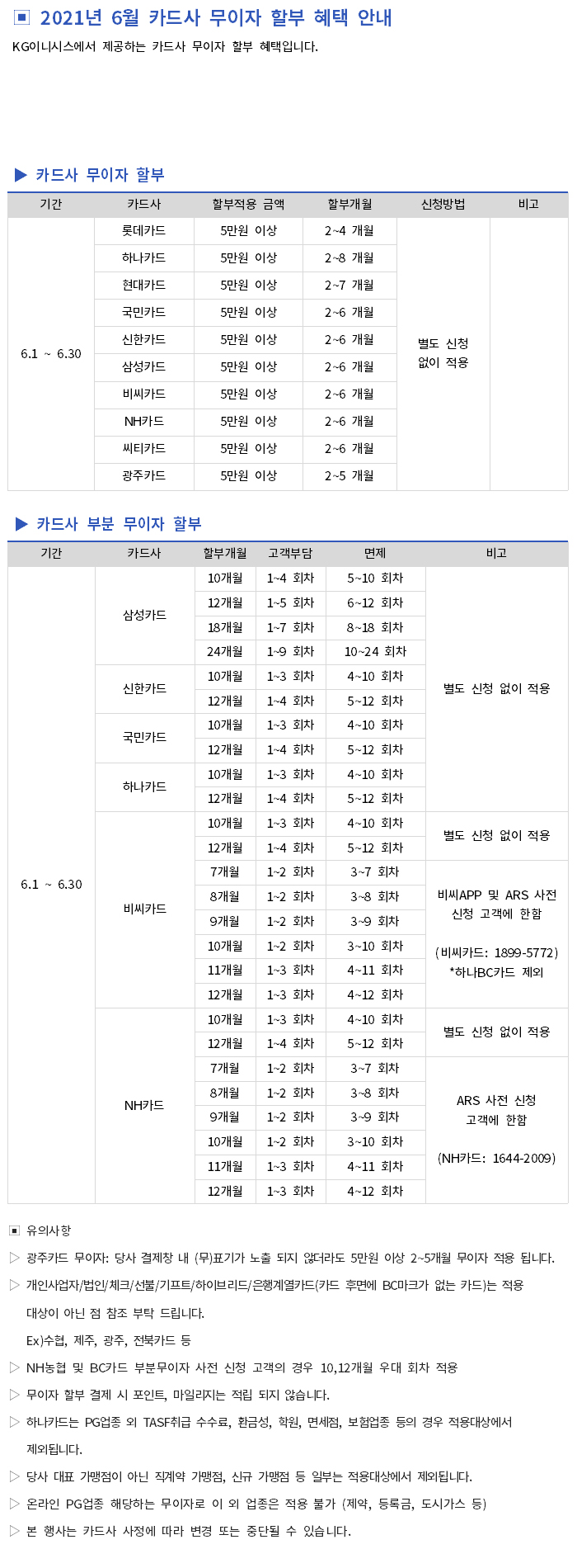 | 2021년 6월 카드사별 무이자 할부안내 |