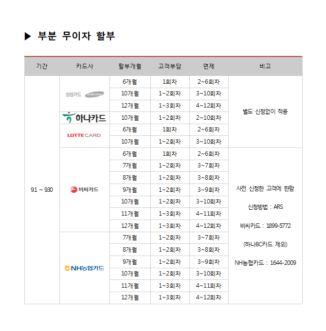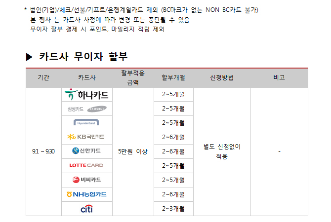 2017년 9월 카드사별 무이자 할부안내