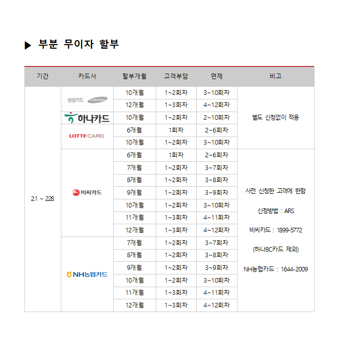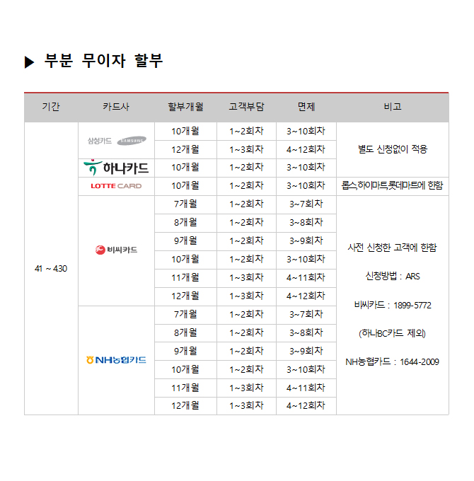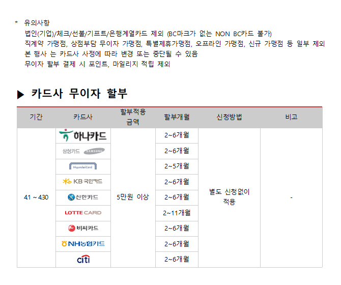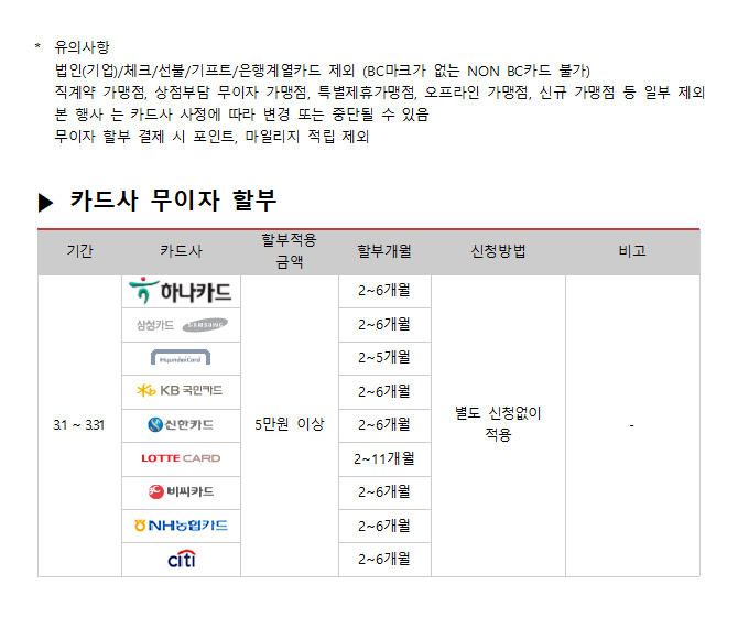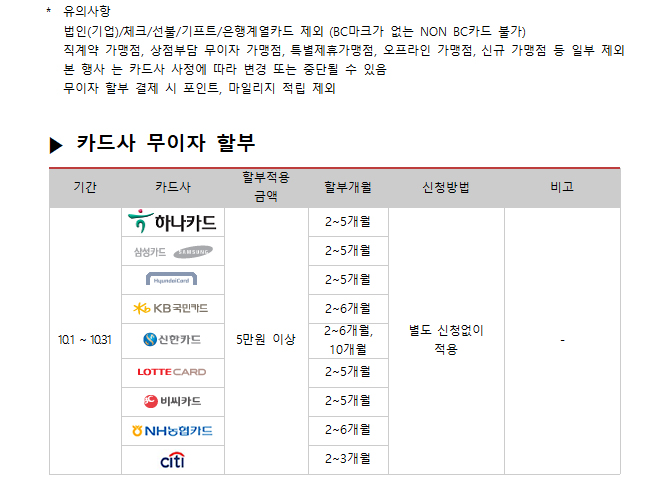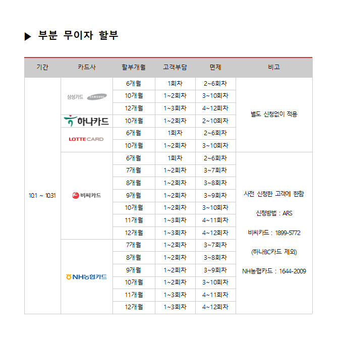 2017년 10월 카드사별 무이자 할부안내