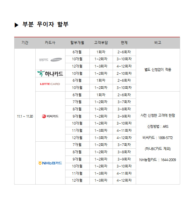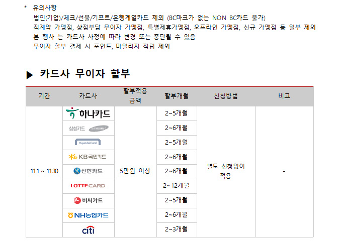2017년 11월 카드사별 무이자 할부안내
