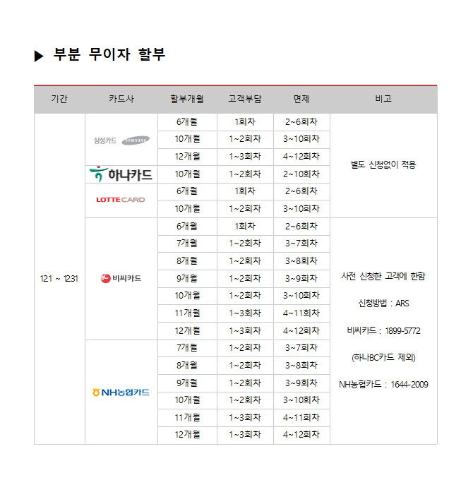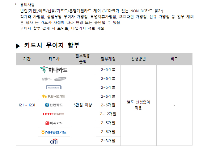 2017년 12월 카드사별 무이자 할부안내
