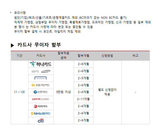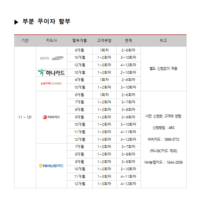 2018년 1월 카드사별 무이자 할부안내