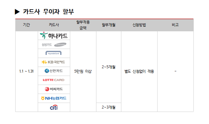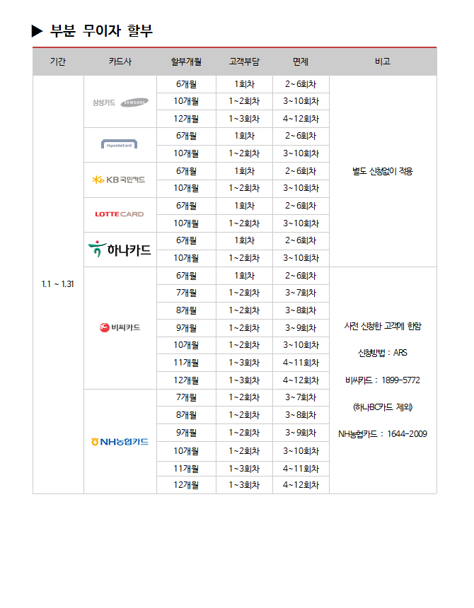 | 2016년 1월 카드사별 무이자 할부안내 |