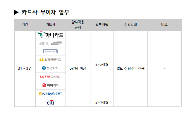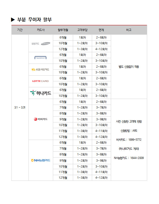 | 2016년 3월 카드사별 무이자 할부안내 |
