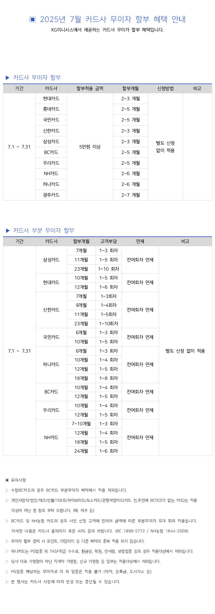 2025년 7월 카드사별 무이자 할부안내