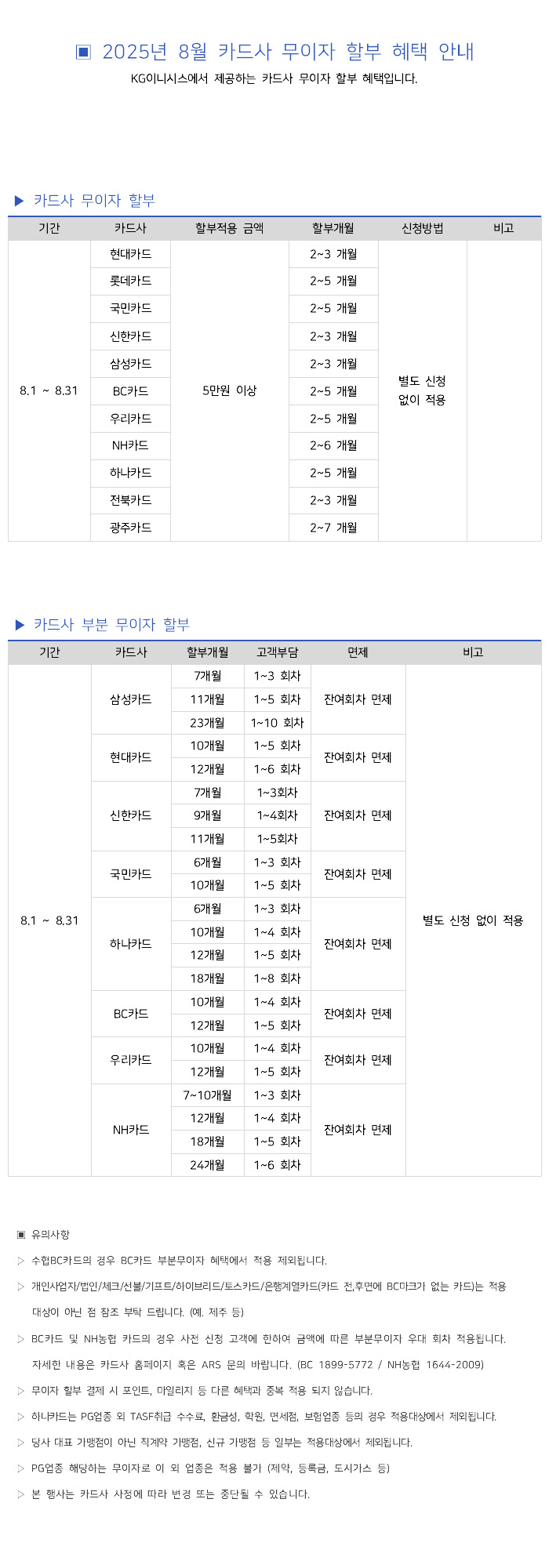 2025년 8월 카드사별 무이자 할부안내