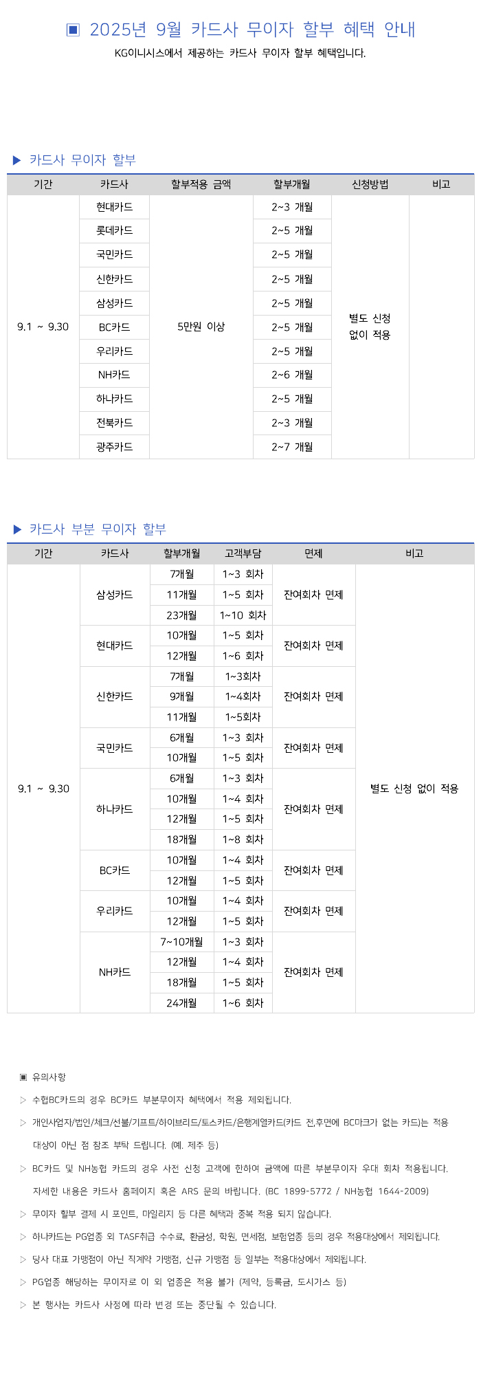 2025년 9월 카드사별 무이자 할부안내