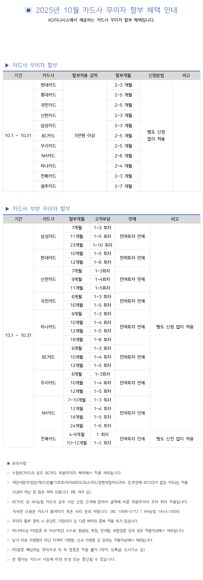 2025년 10월 카드사별 무이자 할부안내