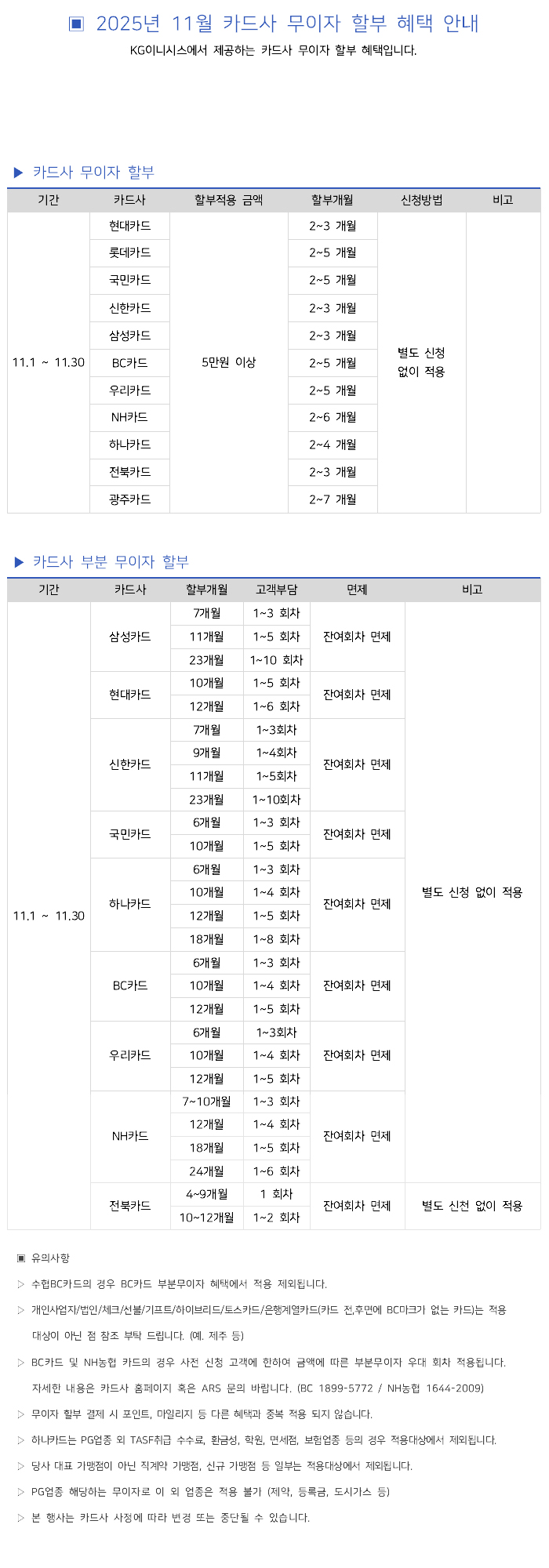 2025년 11월 카드사별 무이자 할부안내