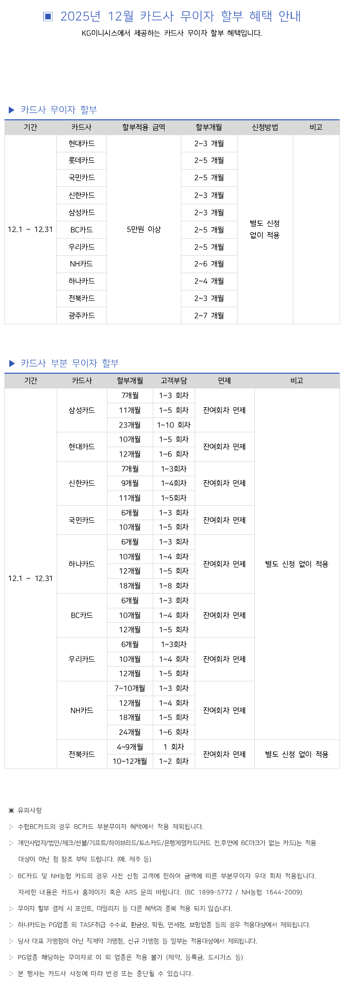 2025년 12월 카드사별 무이자 할부안내