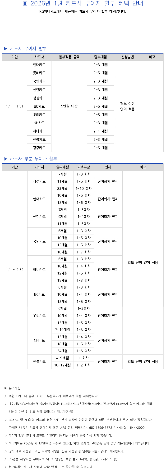 2026년 1월 카드사별 무이자 할부안내