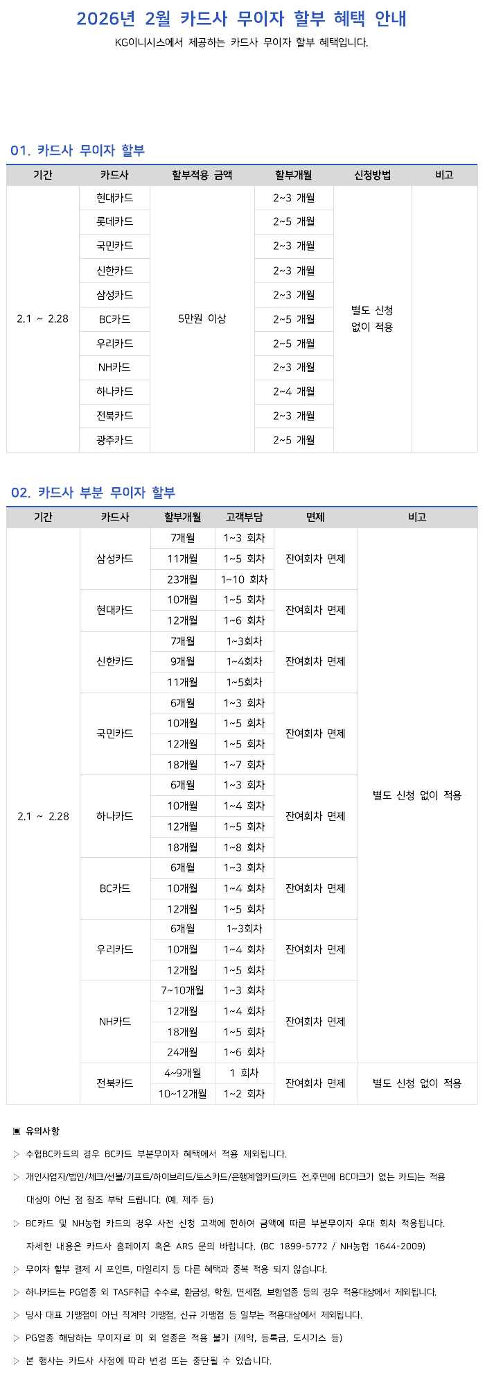 2026년 2월 카드사별 무이자 할부안내