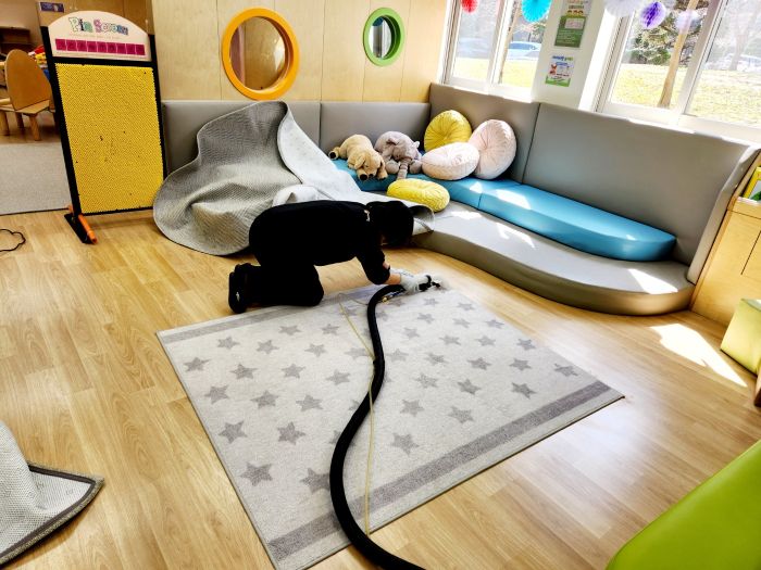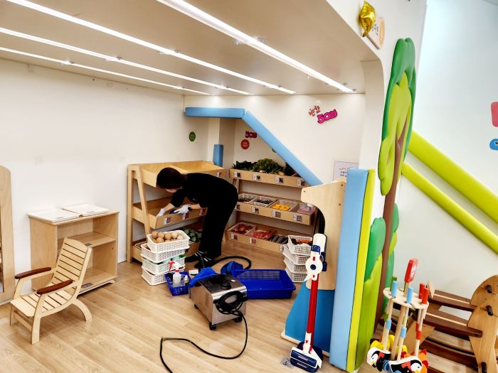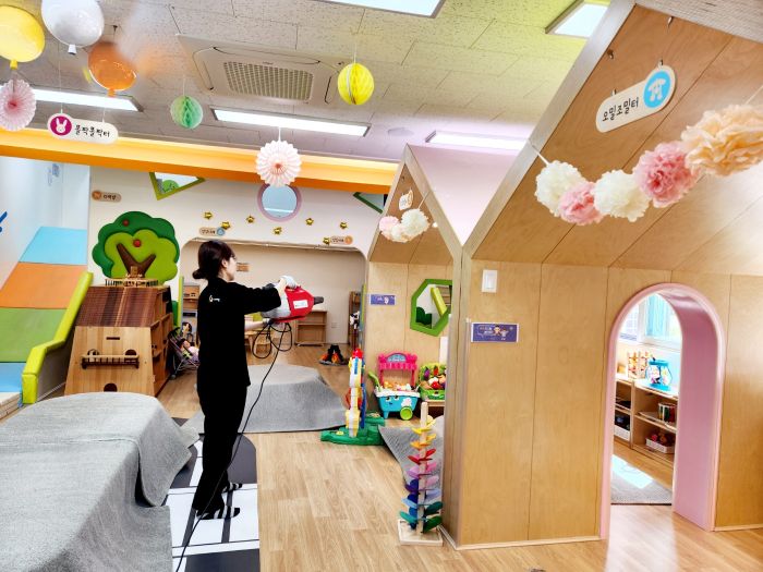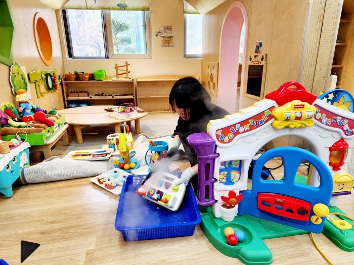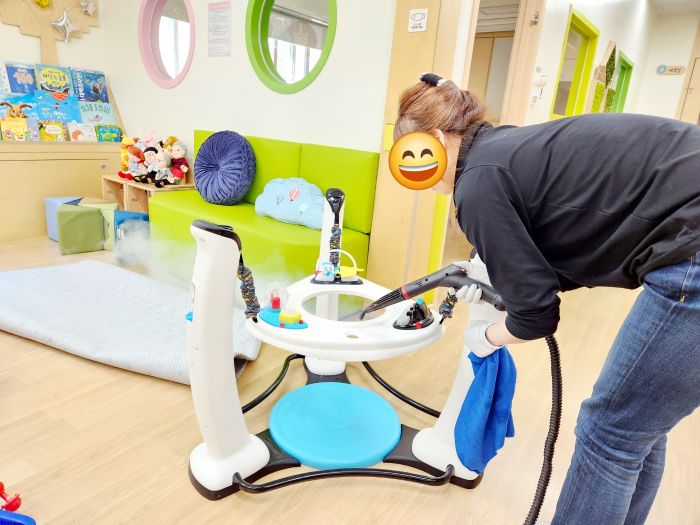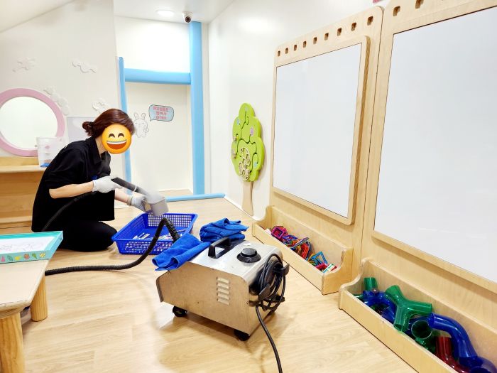 장난감과 시설물 등을 스팀세척살균소독 하였습니당.