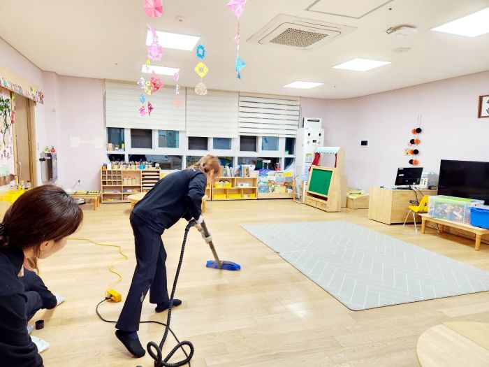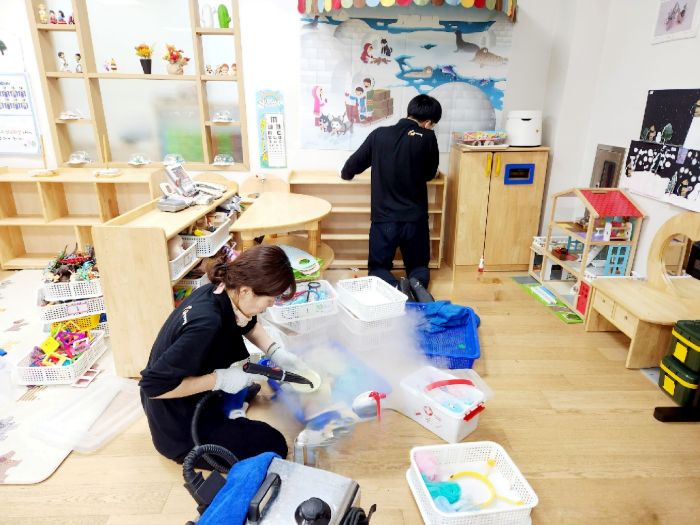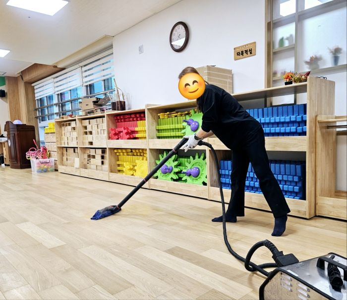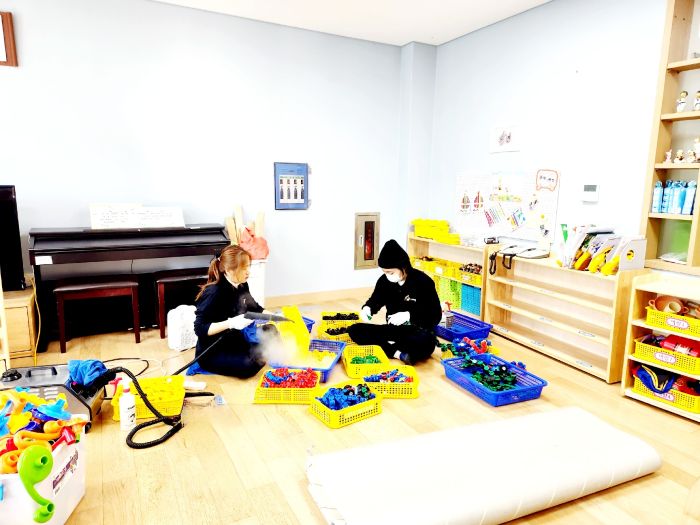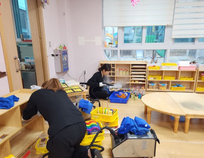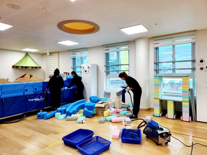 유희실의 교구등을 스팀세척살균소독을 하였습니다.