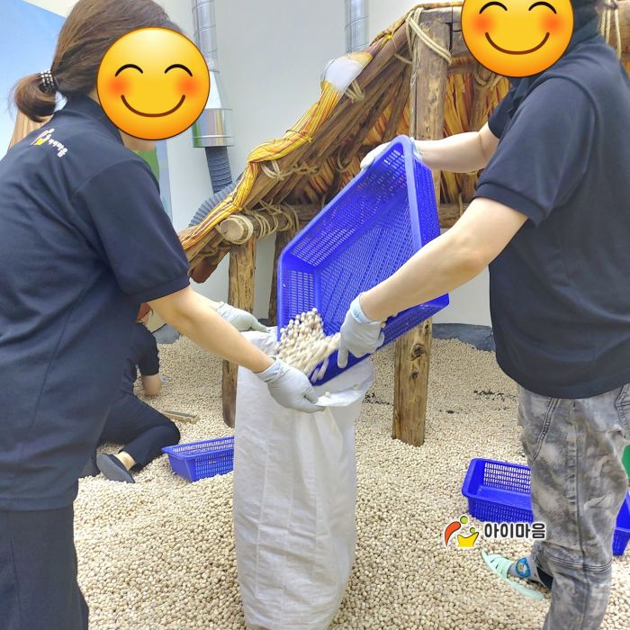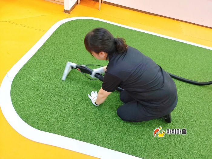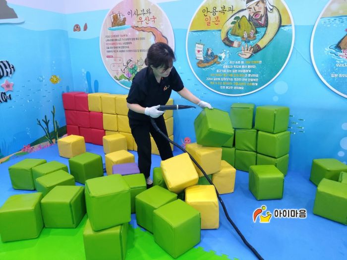 광교박물관 어린이체험존 편백나무칩을 세척소독하고