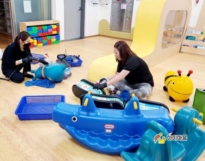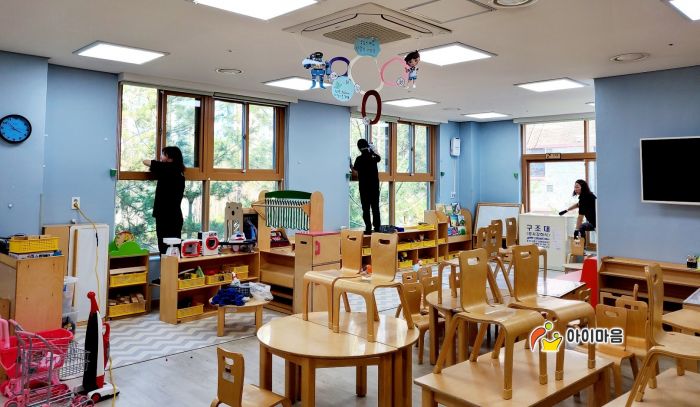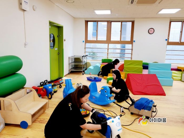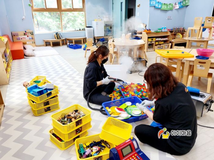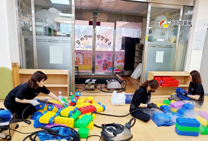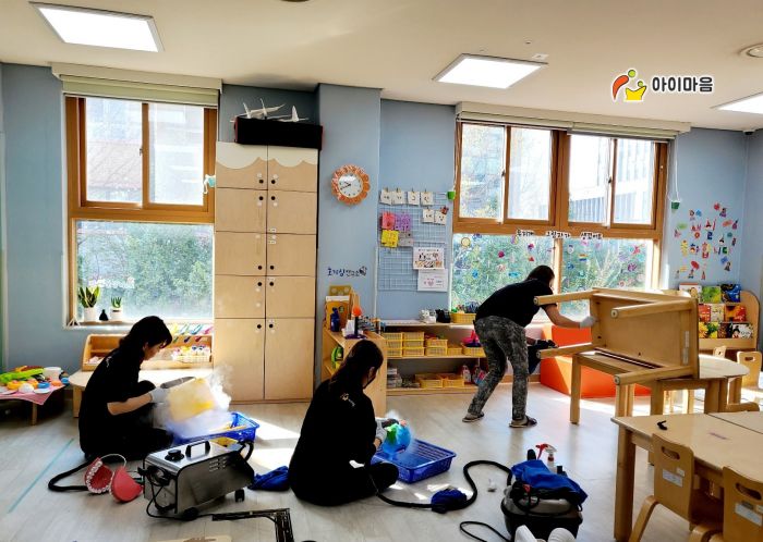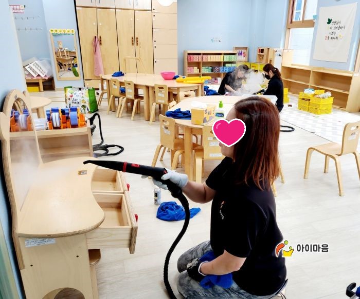 책걸상과 교구장, 교구재등을 스팀세척살균소독 하고