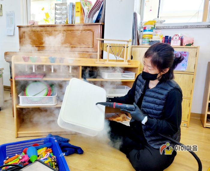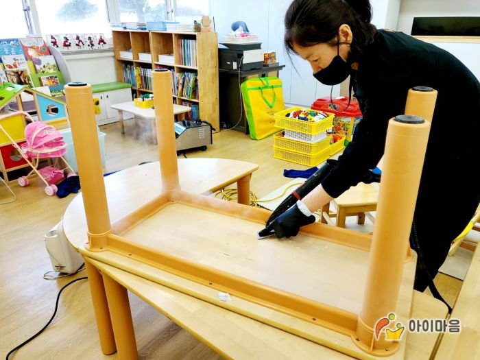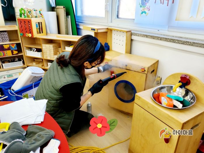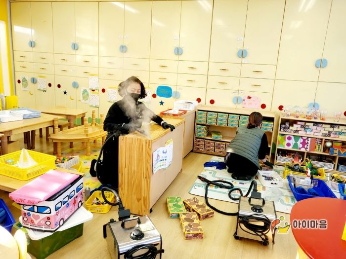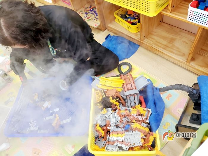 1개교실 교구장,교구재,책걸상,장난감과 창틀, 바닥을