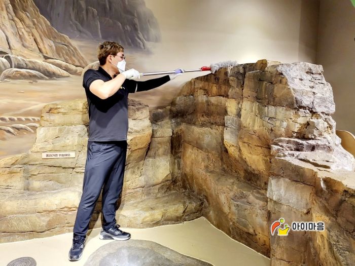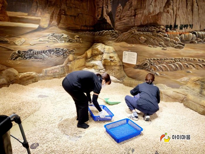 경기북부어린이박물관 공룡화석발굴존 편백나무칩을 세척소독하고