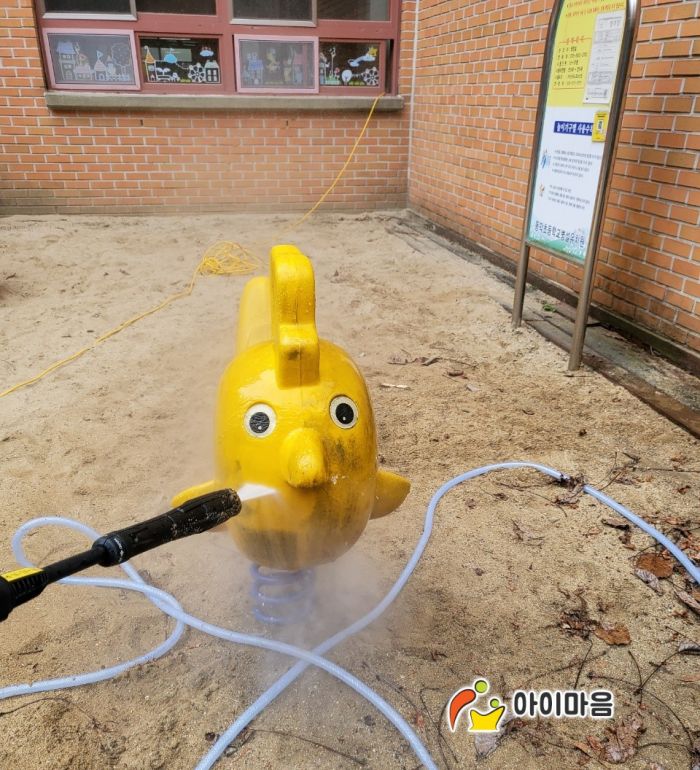 동막초병설유치원 바깥놀이터 시설물을 세척작업하였습니다.