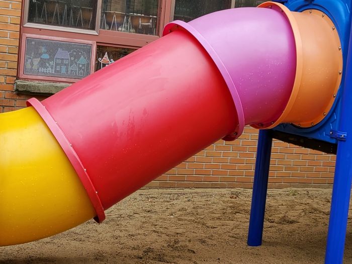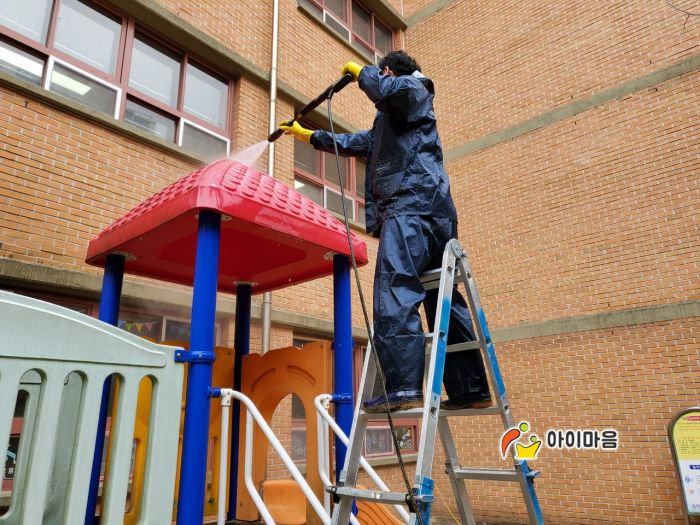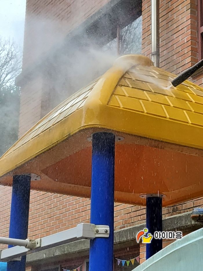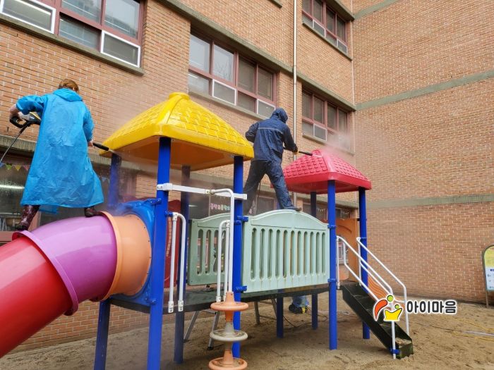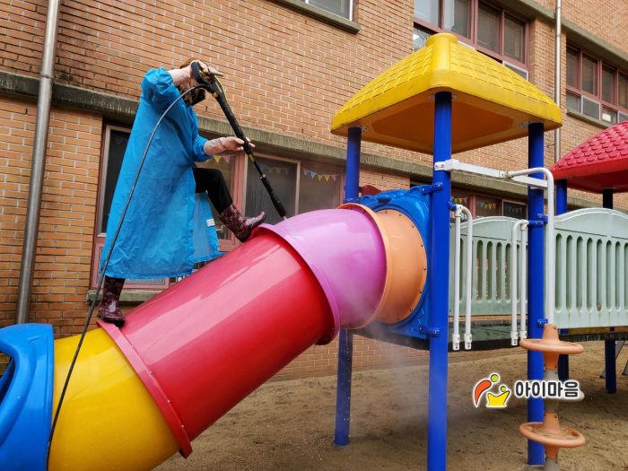 말끔하게 세척된 놀이터에서 해맑은 아이들의 웃음소리가 가득한