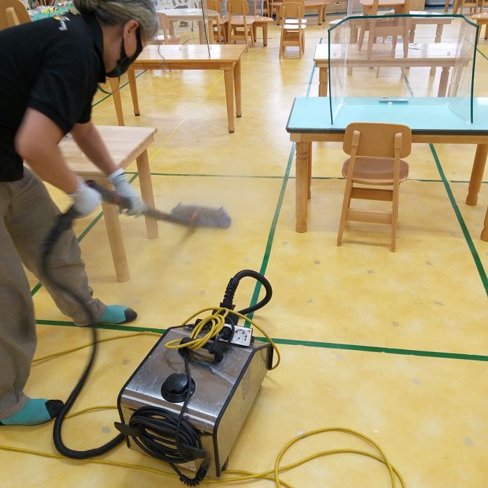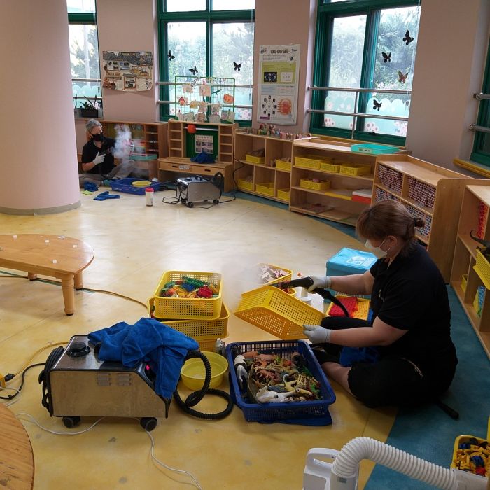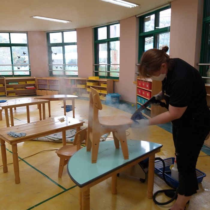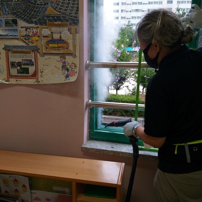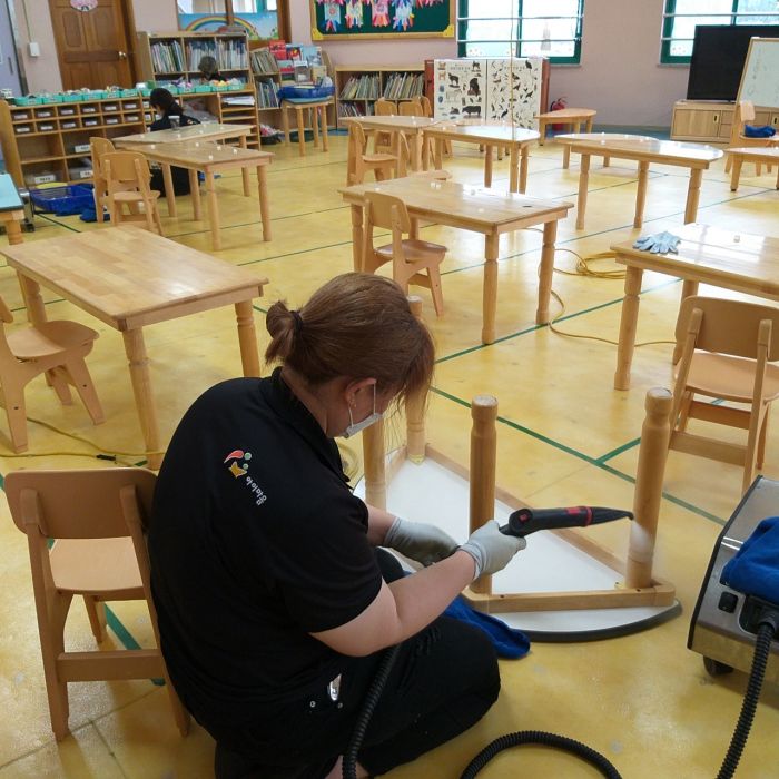 평택송화초병설유치원 책걸상과 교구장, 교구재와 창틀을 스팀세척살균소독 하였습니다.