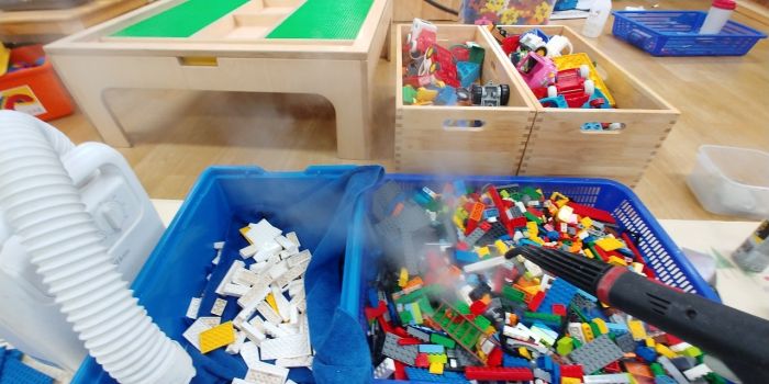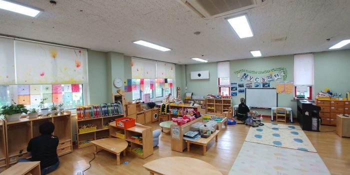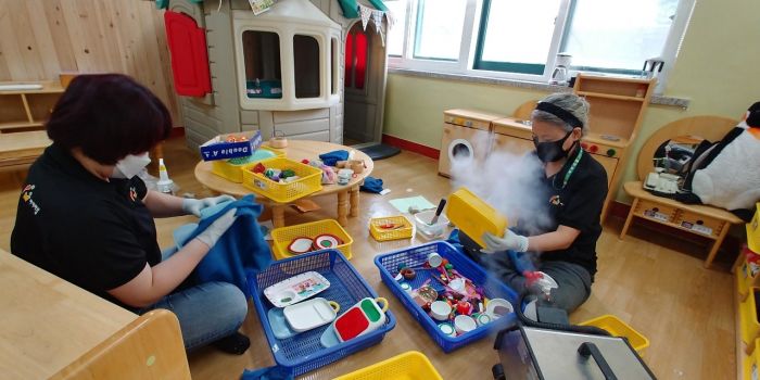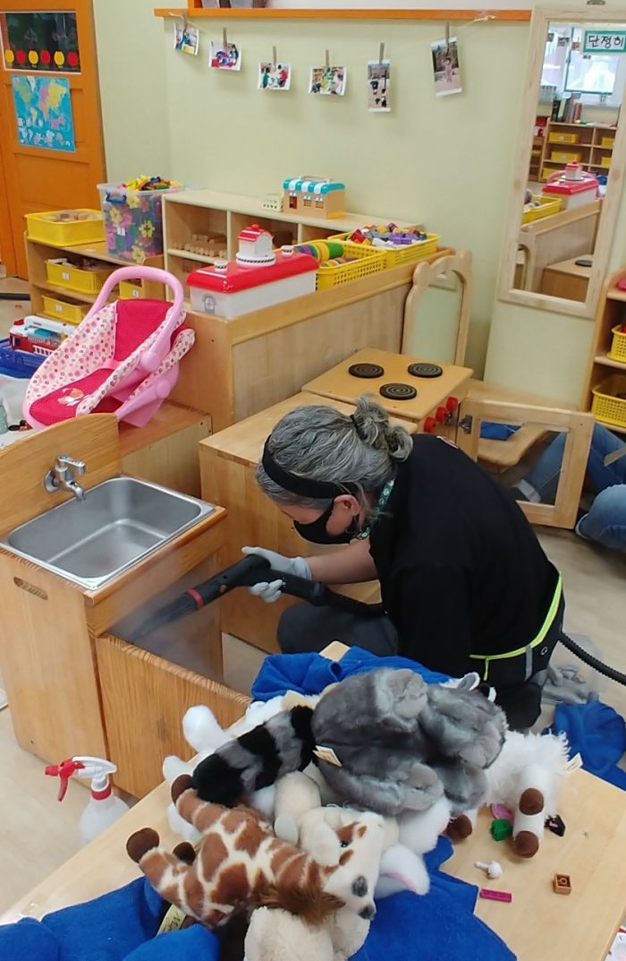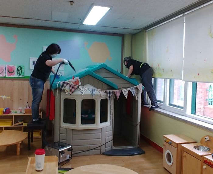 운암초병설유치원 책걸상과 교구장, 교구재를 스팀세척살균소독 하였숩니다.