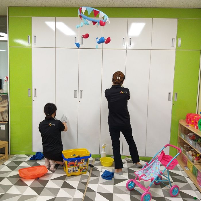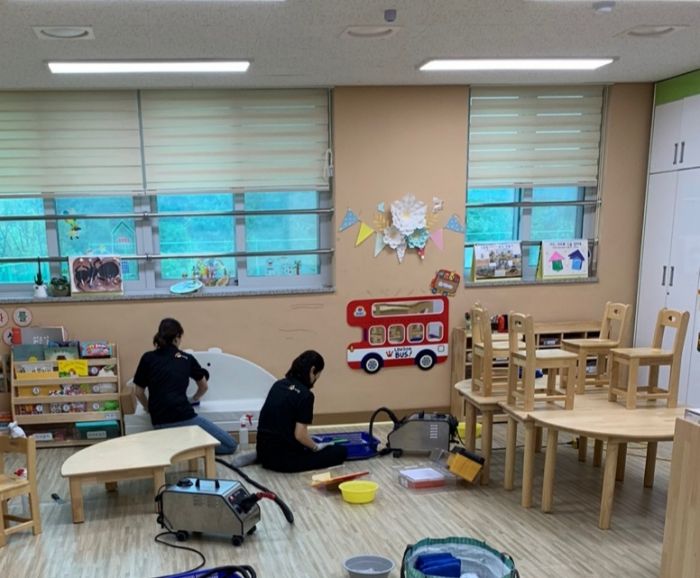 1개실 책걸상과 교구장, 교구재를 스팀세척살균소독 하였습니다.