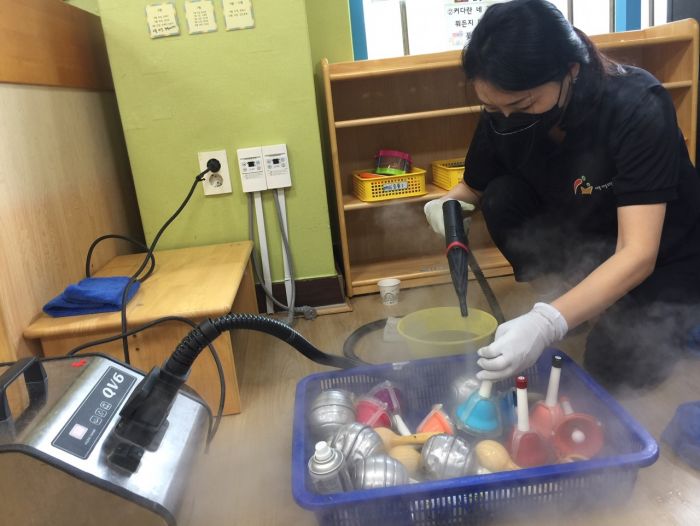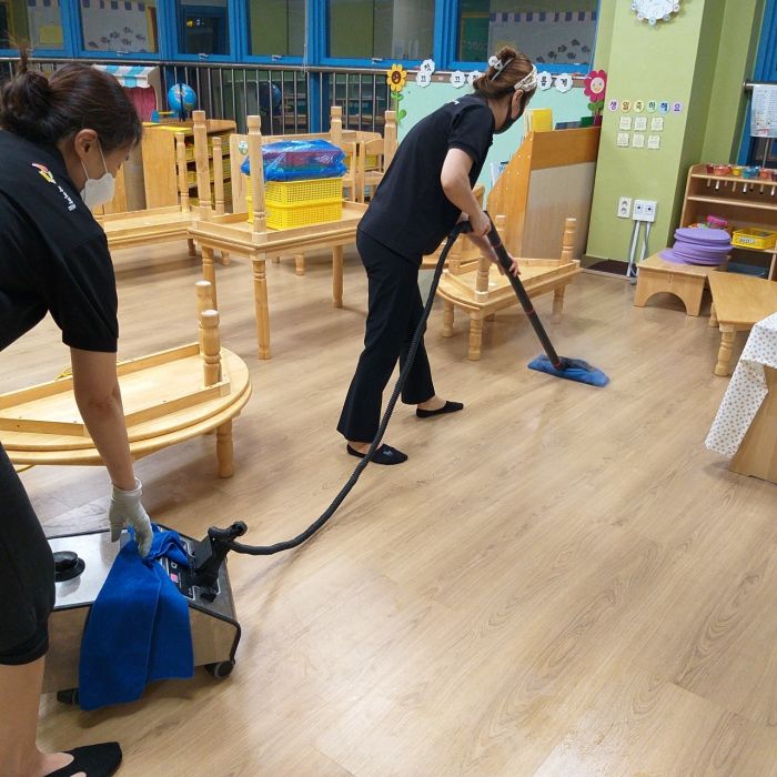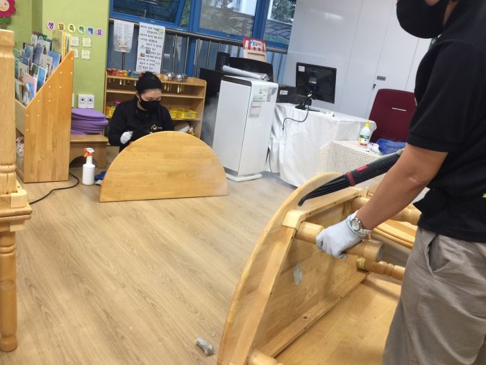 수원 선행초병설유치원 책걸상과 교구장 교구재를 스팀세척살균소독 하였습니다.