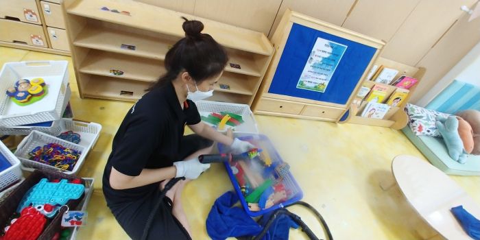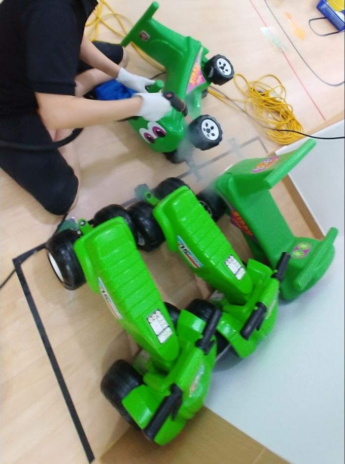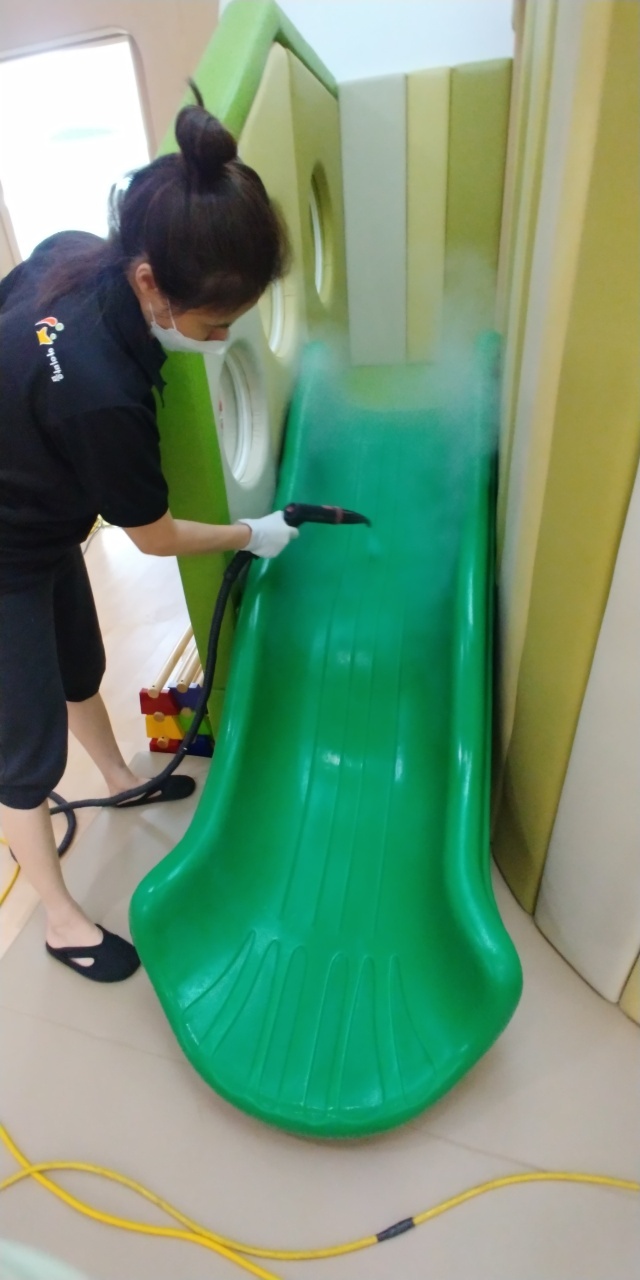 SBS상암 어린이집 책걸상과 교구장, 교구재를 스팀세척살균소독 하였습니다.