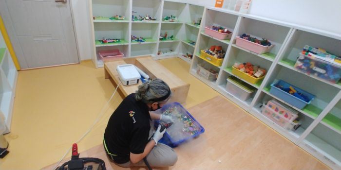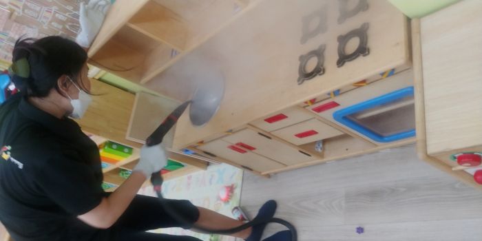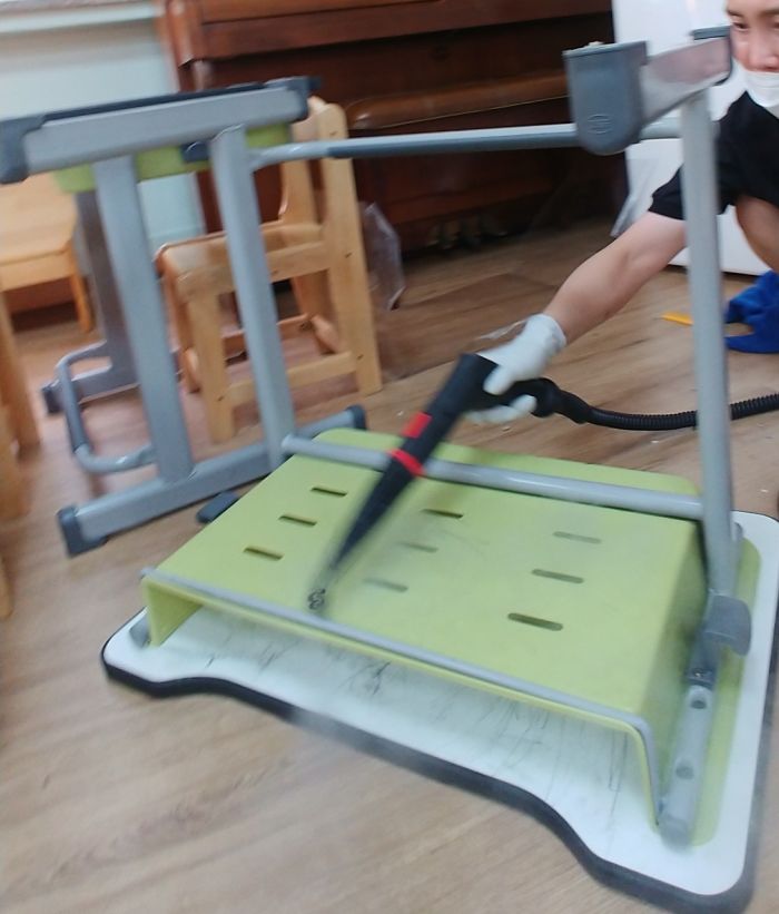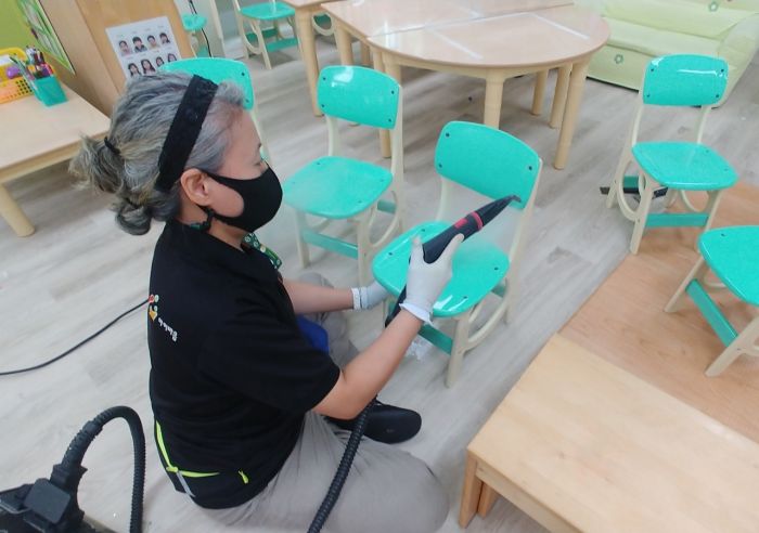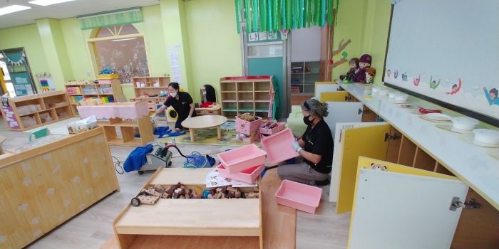 군포화산초병설유치원 책걸상과 교구장, 교구재를 스팀세척살균소독 하였습니다.