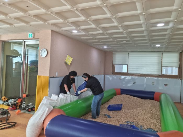 수원법원어린이집 책걸상과 교구장, 교구재, 창틀과 편백나무칩놀이터, 바닥고온살균스팀 등