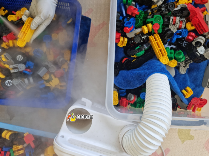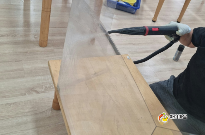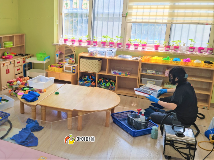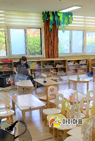 책걸상과 교구장, 교구재등을 스팀세척살균소독하고
