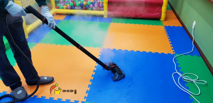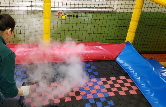 방방이와 체육실 바닥 매트를 170도 고온 스팀을 분사하여 세척살균소독 하였습니다.