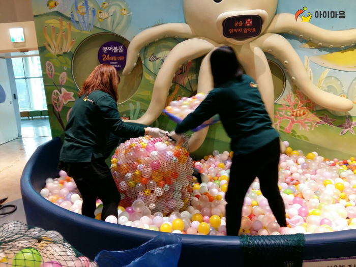 볼풀장을 깨끗하게 청소한후 깨끗하게 소독된 볼풀공을 다시 넣어주는
