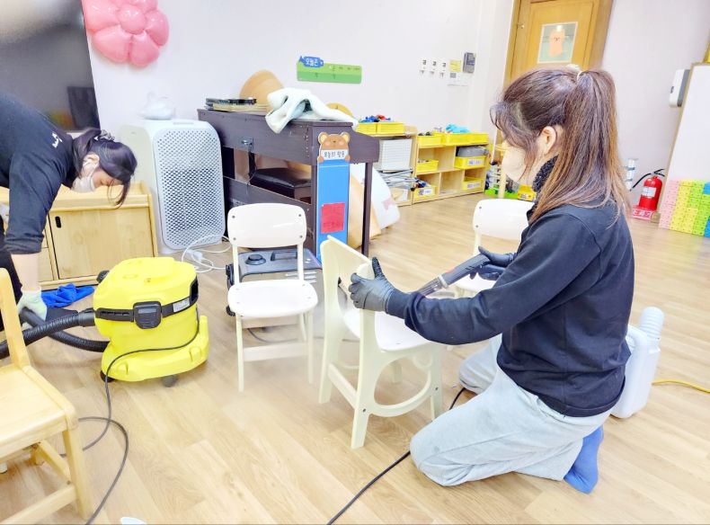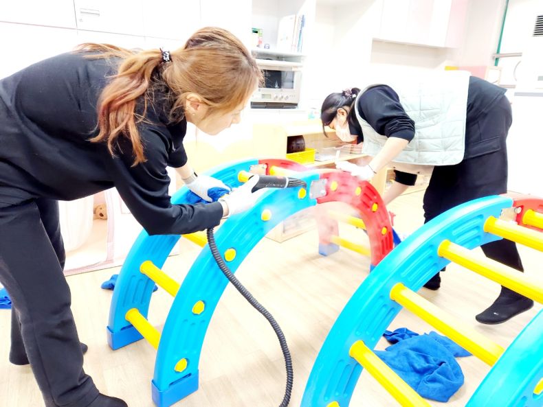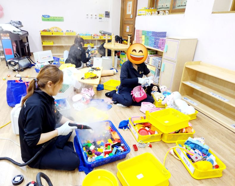 유희실의 정글짐놀이터와 장난감등을 스팀세척살균소독 하였습니다.