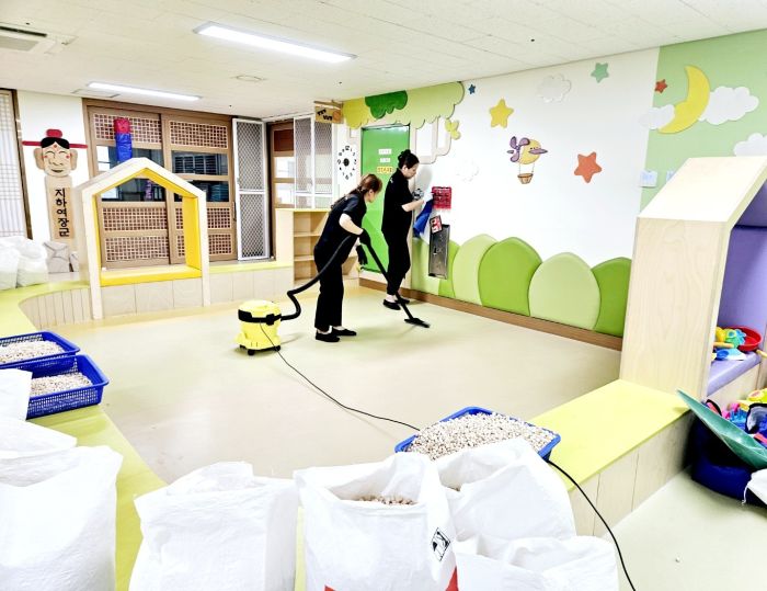 공립단설 다원유치원 편백나무칩놀이터 편백칩 소독을 하였습니다.