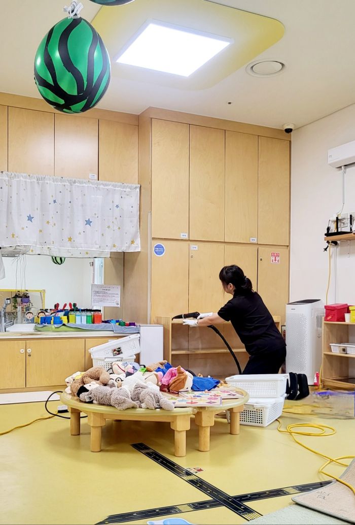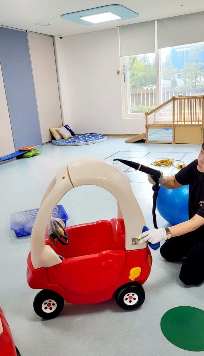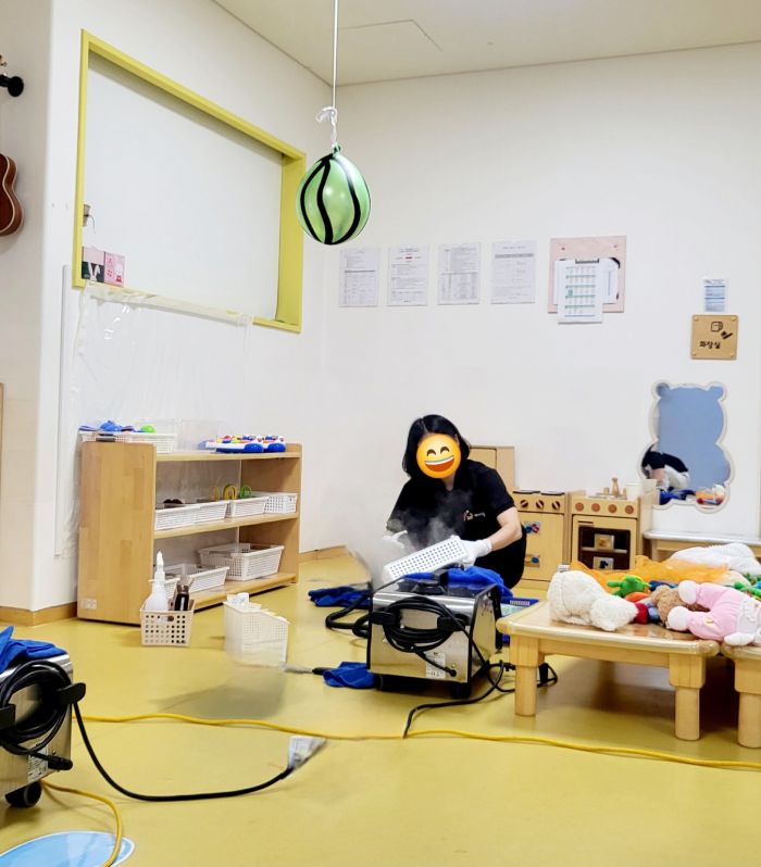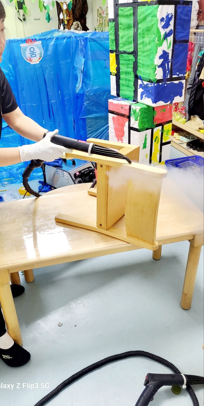 책걸상과 교구장, 교구재를 스팀세척살균소독 하였습니다.