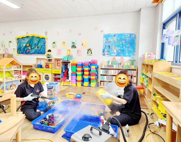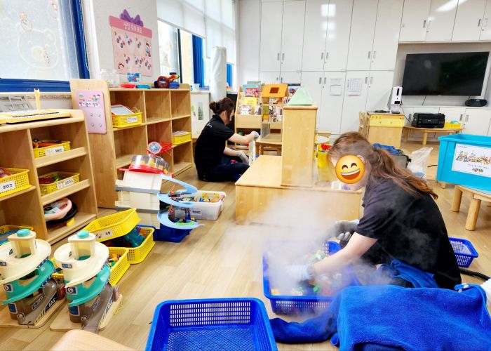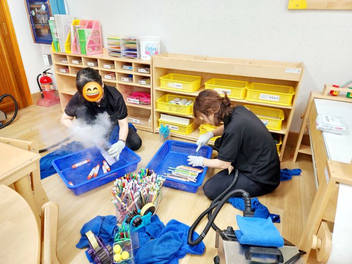 책걸상과 교구장, 교구재를 스팀세척살균소독 하였습니다.